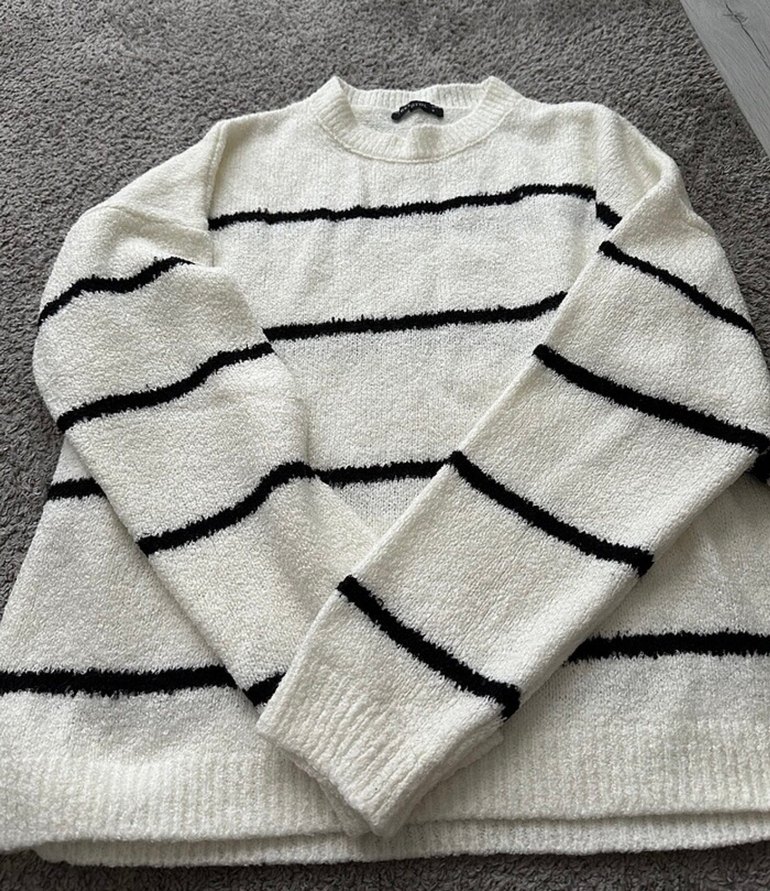 Bu kadın kazağı, bol kesim, uzun kollu ve yuvarlak yaka özelliklerine sahiptir. Sıcak yün malzemeden örülmüş, beyaz zemin üzerinde gri çizgilerle günlük rahat kullanıma uygundur.