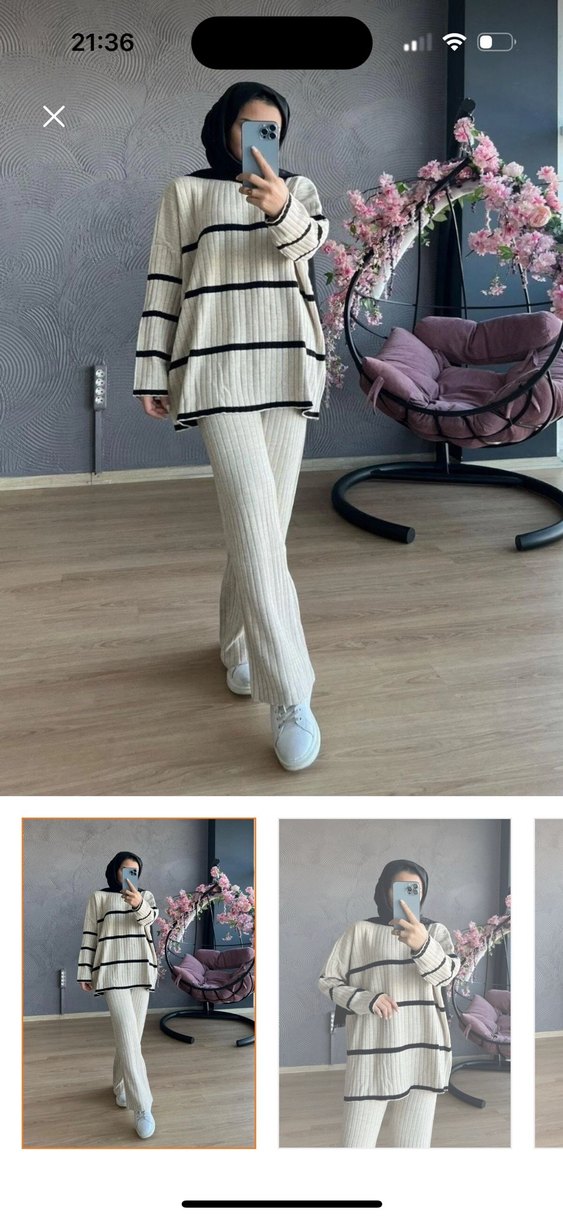 Beyaz çizgili pamuklu, pilili geniş paça pantolon ve tunik günlük rahat ve trend görünüme uygun.