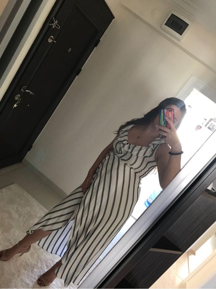 drapeli detaylı ve bol kesim uzun önden yırtmaçlı elbise İnce askılı, beyaz çizgili ve sentetik kumaştan günlük rahat kullanım için uygundur.