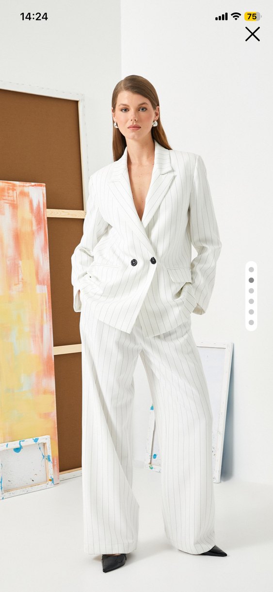 Beyaz çizgili, uzun kollu ve düğmeli ön kısmı olan uzun kesim blazer ceket. Ofis için uygun, regular fit ve modern tarzda, sentetik kumaştan üretilmiştir.