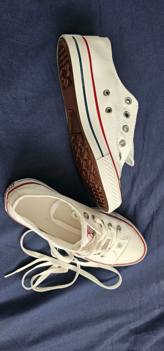 Pamuk kumaştan, elastik detaylı, düz tabanlı ve renkli çizgili beyaz kadın spor ayakkabısı. Günlük kullanıma uygundur.
