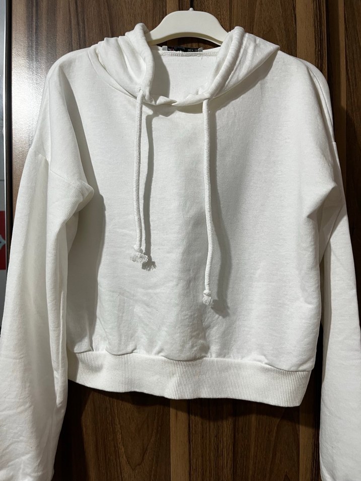 Beyaz renkli, uzun kollu crop sweatshirt, rahat kesimi ve kısa boyuyla gündelik sokak stiline uygun. Yumuşak keten kumaştan yapılmıştır, sade ve şık bir görünüm sunar.