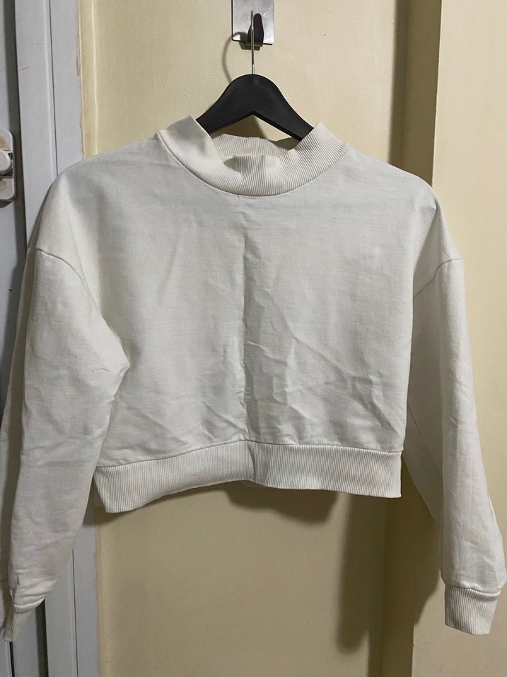 Kadınlar için bisiklet yaka ve uzun kollu crop sweatshirt. Desensiz, sade beyaz renkte, günlük sokak stili için uygun.