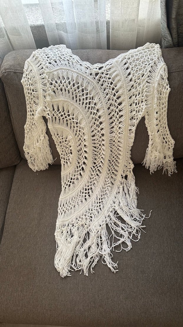 Kadın beyaz dantel monokini, uzun kollu ve bol kesimdir. Kısa boyuyla cesur bohem plaj tarzı sunar.