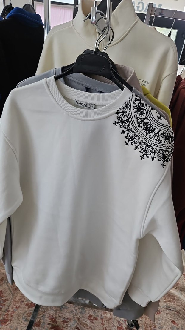 bedenler mevcuttur.Beyaz, yuvarlak yaka ve uzun kollu kadın sweatshirt, bol kesim ve omuzda baskılı dantel detayı ile sokak stiline uygun.