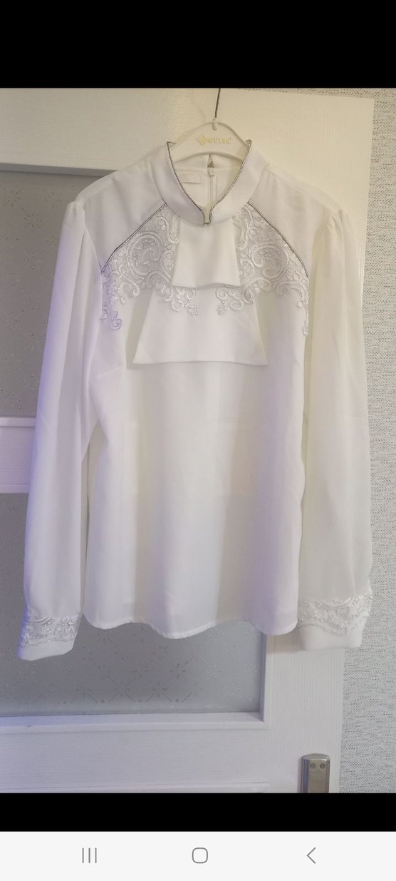 Beyaz, yüksek yakalı, uzun kollu ve dantel işlemeli kadın gömleği. Rahat kesim ve normal boy, ofis için uygun. Sentetik kumaştan yapılmıştır.