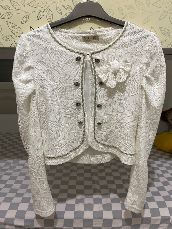 beyaz, dantel örgüden yapılmış, uzun kollu ve işlemeli desenlere sahip, oturan kesim bolero. süs düğmeleri bulunur.