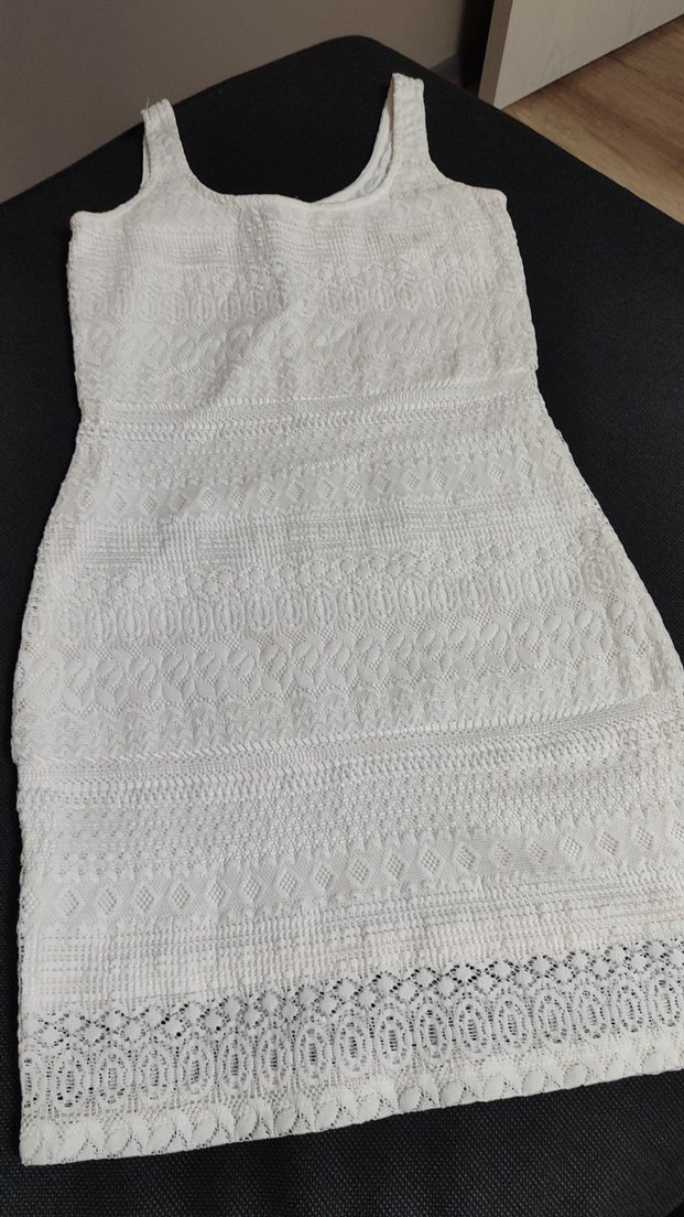 Bu beyaz triko elbise, dantel nakış detayları ve kayık yaka ile bohem tarzını yansıtıyor. Kolsuz ve vücuda oturan kesime sahip.