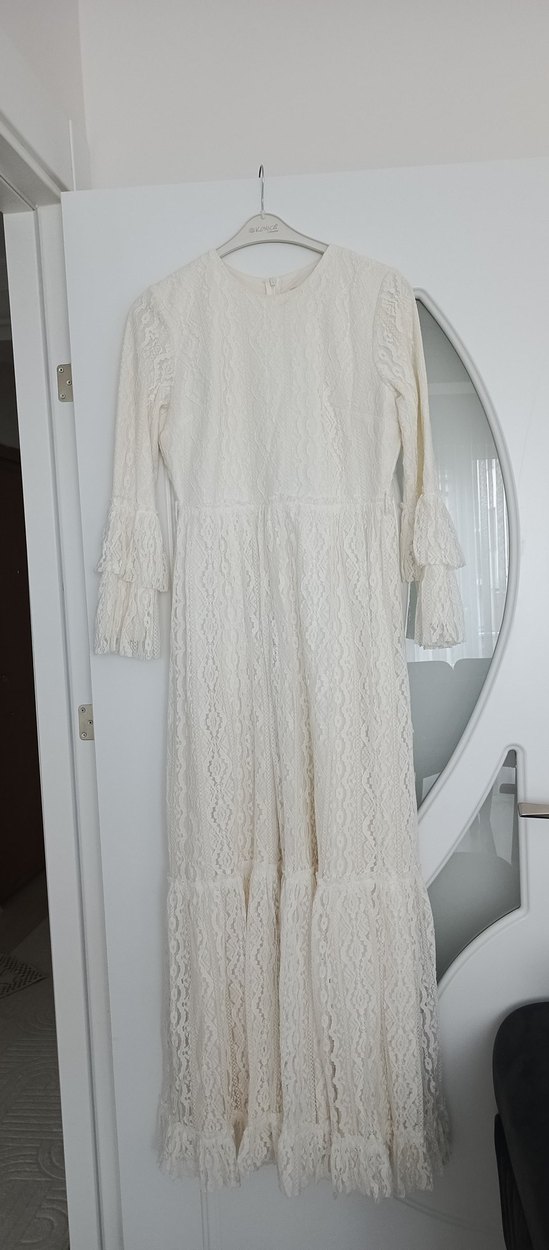 Beyaz dantel detaylı, uzun kollu, yuvarlak yakalı bohem tarzda uzun elbise. Yumuşak örme kumaştan, düzenli kesim ve düğün için uygun.