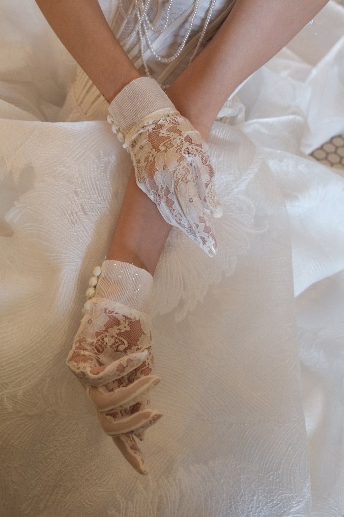 Beyaz dantel ve inci detaylı, örme kumaştan vintage bohem tarzda kadın eldiveni. Klasik zarafet için ideal.