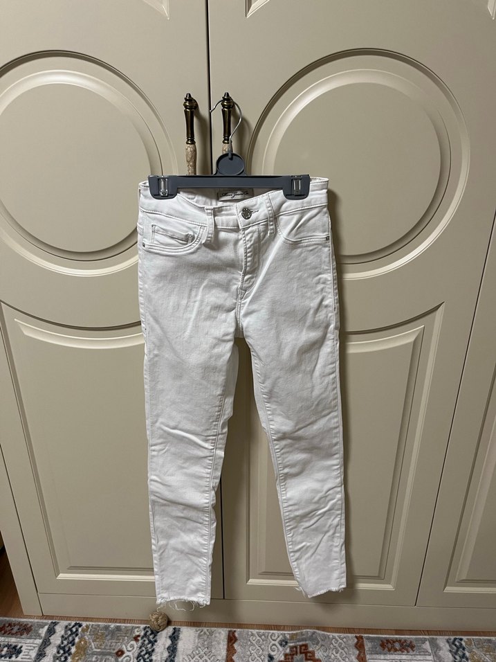 Beyaz renkli, dar kesim kot pantolon. Normal midi boyda, tokalı detaylı, günlük kullanıma uygun sade ve şık model. 1 kez giyindi çünkü kilo aldım sağlam bir kusuru yok sadece ütü lazım katlayıp koymuştum o kadar temiz