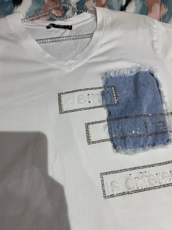 Kadınlar için beyaz tişört, yuvarlak yaka ve kısa kollu, bol kesimdir. Baskılı tasarıma ve önünde düğmeli denim detayına sahiptir, trendi günlük stil için uygundur.