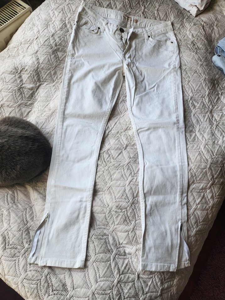 Kadınlar için beyaz denim pantolon, normal kesim ve bileklerde fermuar detaylıdır. Günlük kullanım için uygun, rahat bir sokak stili pantolondur.