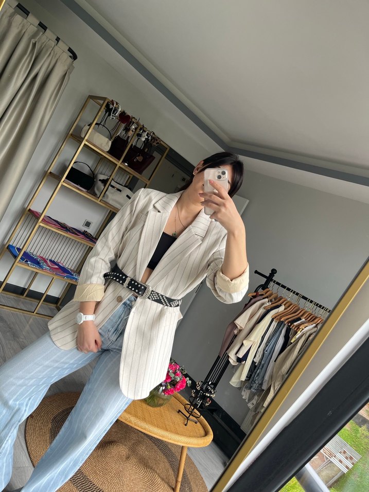 Kadınlar için beyaz denim kumaştan, kuşaklı ve çentikli yaka detaylı, uzun kollu regular fit blazer. Günlük sokak stiline uygun hafif bağlamalı model.