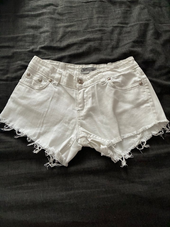 Gevşek kesim ve yıpranmış kenar detaylarına sahip beyaz denim mini şort, gündelik kullanım için rahat ve şık bir stil sunar.
