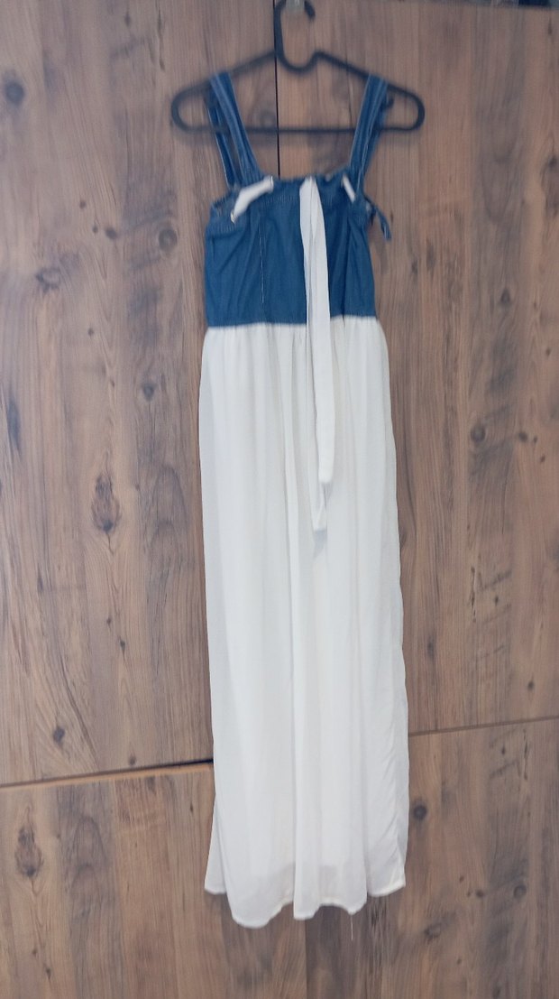 Kadınlar için kolsuz, straplez, bol kesim uzun elbise. Denim ve yumuşak kumaştan, mavi ve beyaz renklerle bohem tarzda drapeli model. Günlük kullanım için uygun.