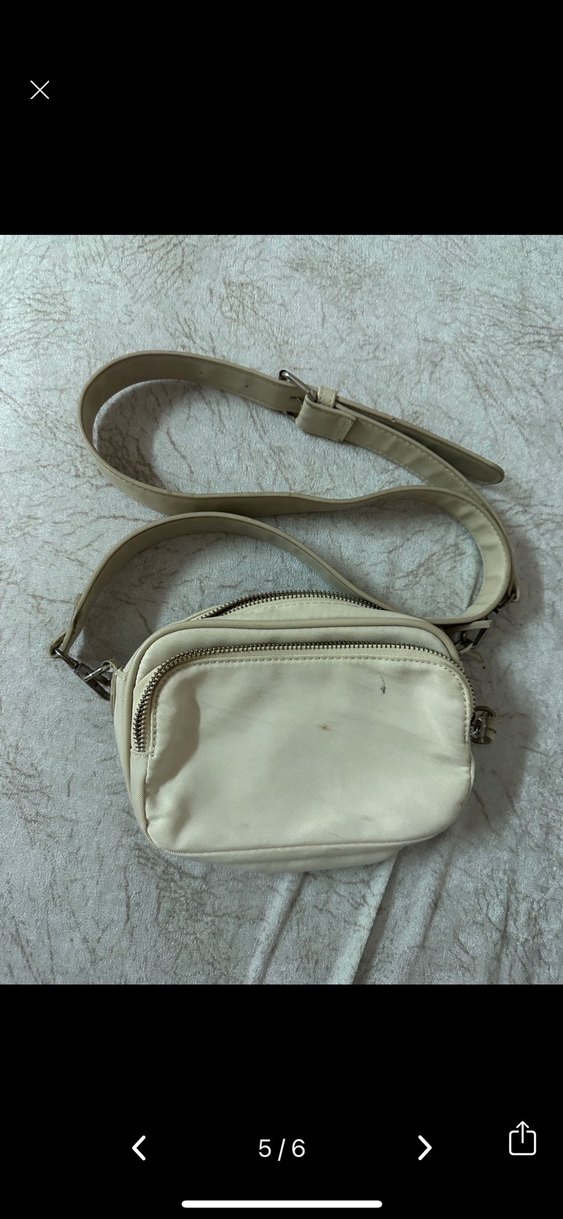 Beyaz deri çapraz çanta, ayarlanabilir tokalı askı ve iki fermuarlı bölmeye sahip, günlük sokak stili için uygun minimalist tasarım.