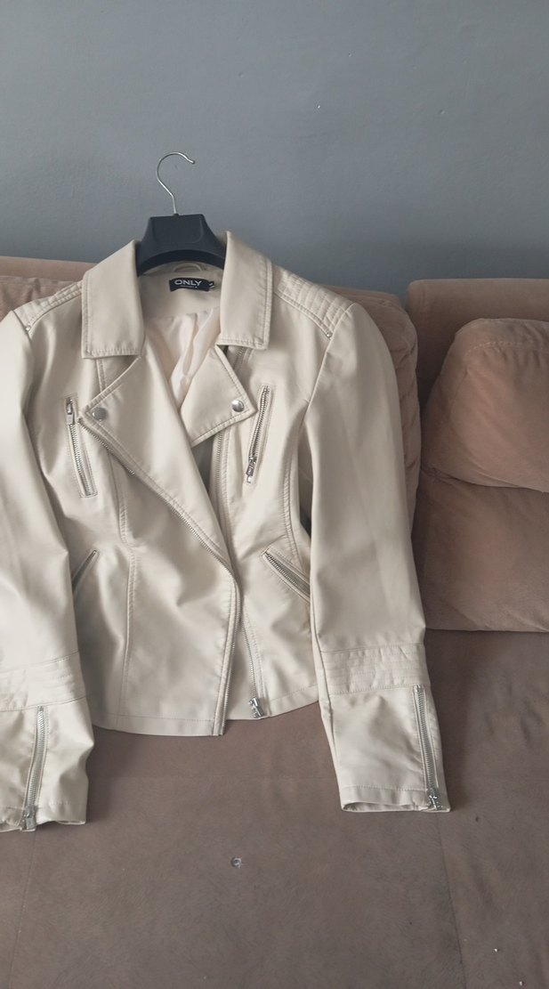 Beyaz deri ceket, kesik yaka ve düğmeli detaylara sahiptir. Strappy kollu, normal kesim ve günlük kullanıma uygun, trend rahat tarzda bir üründür.