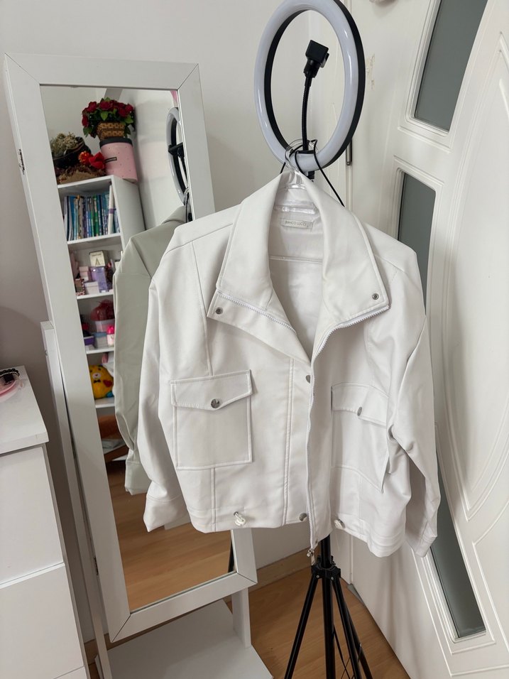 Beyaz deri ceket, düğmeli cepleri, uzun kollu xl beden beyaz deri ceket defosuz 2 kez giydim