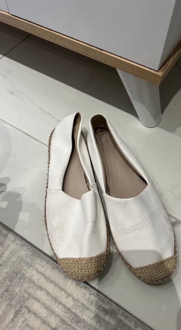 Kadınlar için beyaz deri espadril. Minimalist ve çağdaş tarzda, günlük kullanım için uygun.