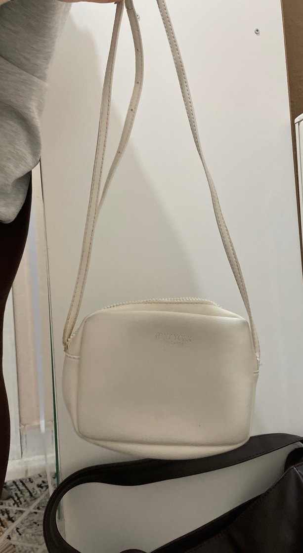 Beyaz deri çapraz çanta, minimal tasarımlı ve fermuarlı. Günlük kullanıma uygun, sade ve normcore tarzda, pastel tonlarda.