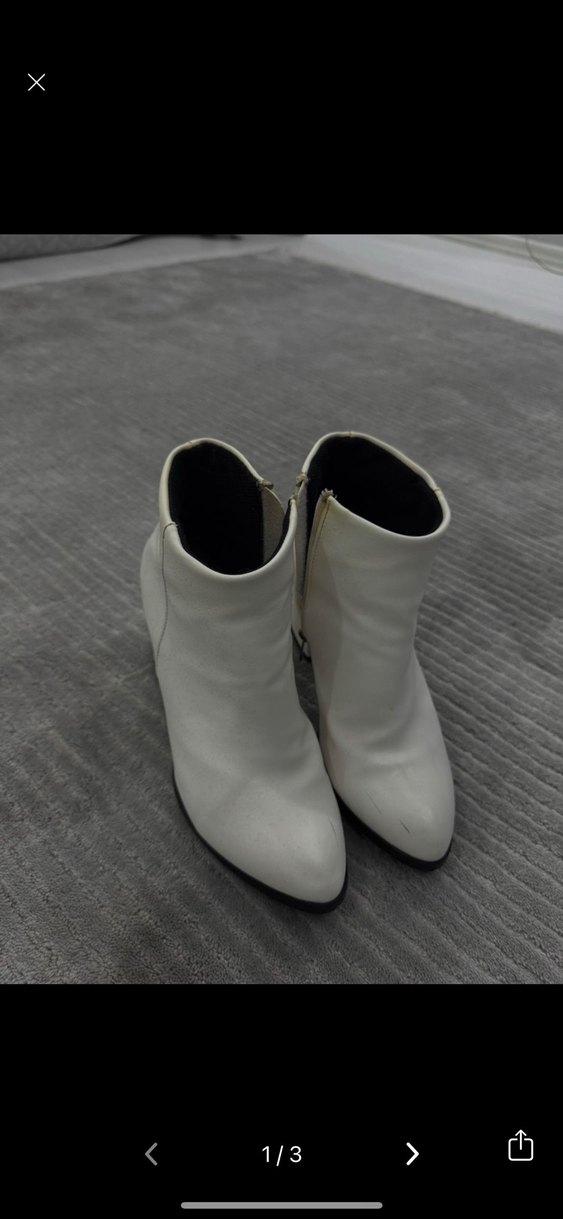Beyaz deri, stiletto topuklu ve tokalı kadın botları, minimalist tarzda günlük sokak giyimi için uygundur.