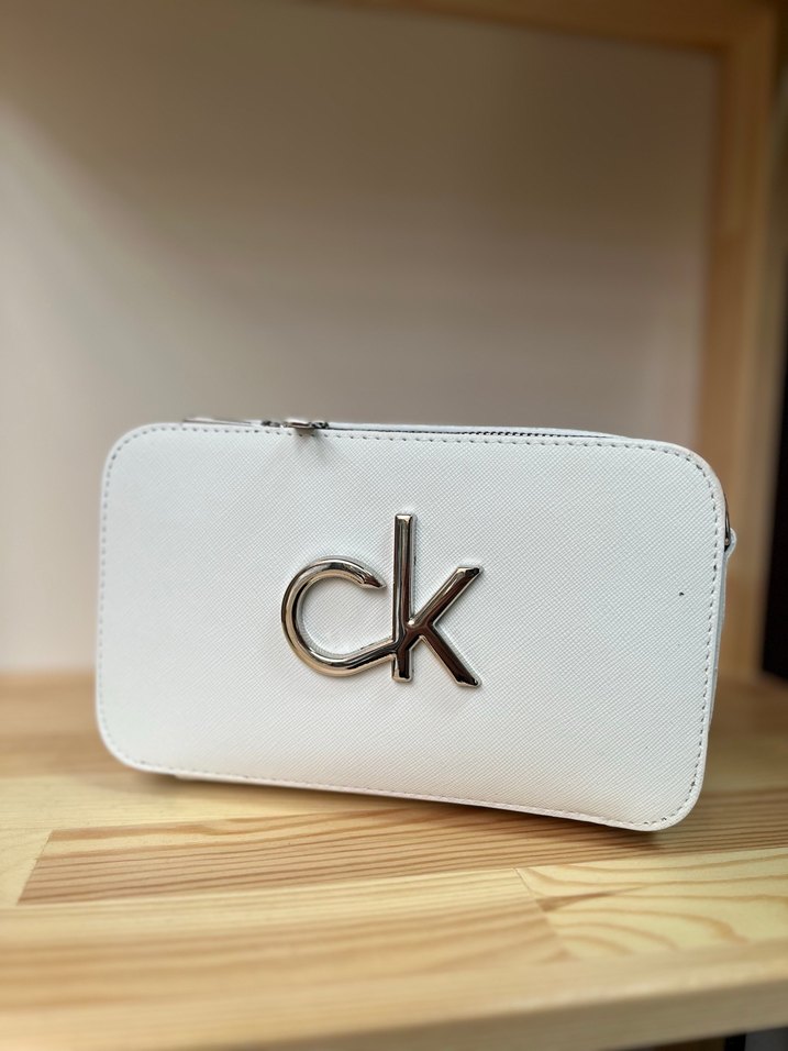 Beyaz deri tokalı çapraz çanta, minimal baskılı "ck" logosu ile modern ve şık bir görünüm sunar.
