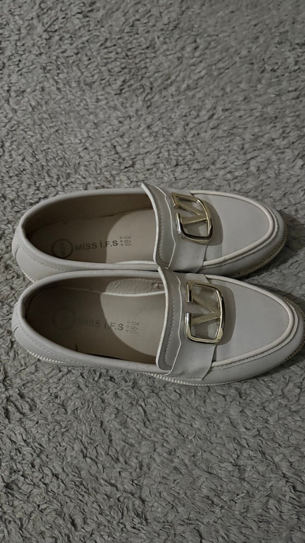Beyaz deri loafer ayakkabı, tokalı detaylı, modern klasik tarzda, trendi ve rahat bir görünüme sahip. Desensiz, yumuşak gri tonlarında.