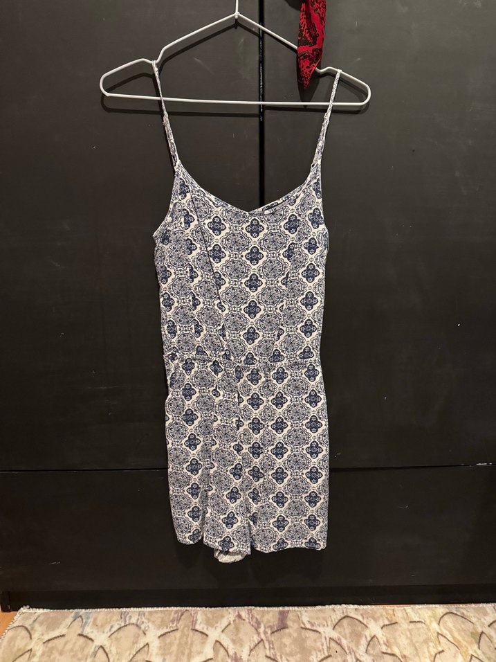 Kadınlar için ince askılı, desenli ve beyaz-gri tonlarda kumaştan yapılmış, vücuda oturan kısa tulum. Günlük sokak stili ve bohem tarzı sunar.