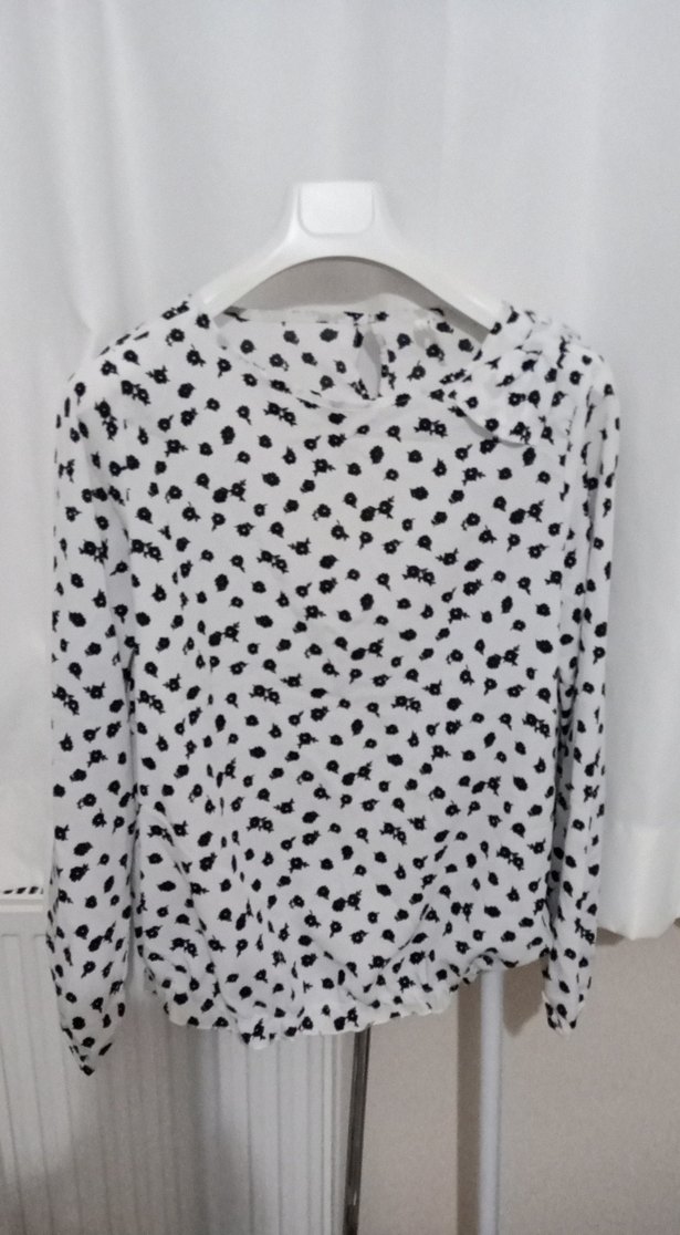 Kadınlar için beyaz sentetik kumaştan, uzun kollu, yuvarlak yakalı, düğmeli ve desenli bol kesim bluz. Günlük kullanıma uygundur.