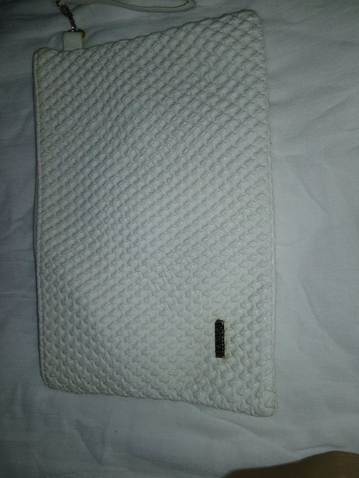 Sentetik kumaştan yapılmış, dokulu yüzeye ve fermuarlı kapanmaya sahip beyaz clutch çanta. Sade ve minimal tasarımlı,günlük rahat kullanım için uygun.