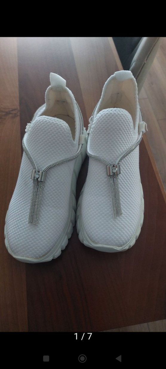 Sentetik kumaştan yapılmış, kapanışlı ve dolgu topuklu beyaz kadın spor ayakkabısı. Günlük kullanım ve sokak stili için uygundur. ️