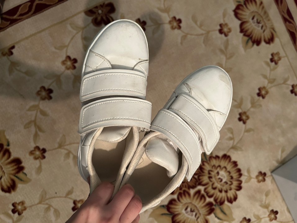Beyaz renkli, dolgu topuklu ve tokalı bantlı kadın spor ayakkabısı. Kauçuk tabanlı, minimalist tarzda günlük kullanıma uygun.