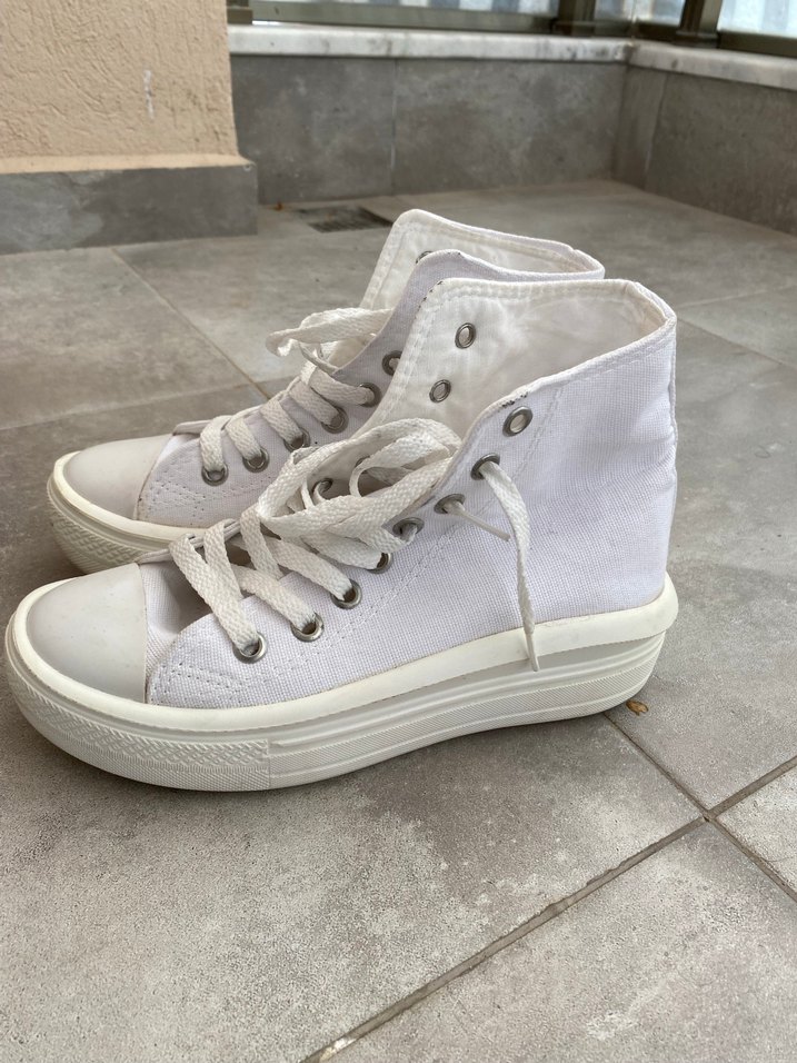 Beyaz dolgu topuklu kadın spor ayakkabısı, kauçuk malzemeden üretilmiş, desen içermeyen sade tasarımıyla günlük kullanıma uygundur. Trend sokak stili için ideal.