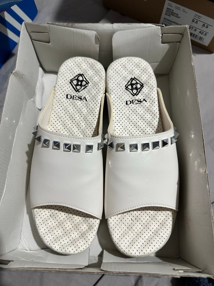 Kadın beyaz dolgu topuklu terlikler, baskılı yastıklı taban ile metalik perçinler içerir. Dayanıklı kauçuk malzemedendir, günlük kullanım ve sokak stilini birleştirir.ortopedik bi kez giyildi