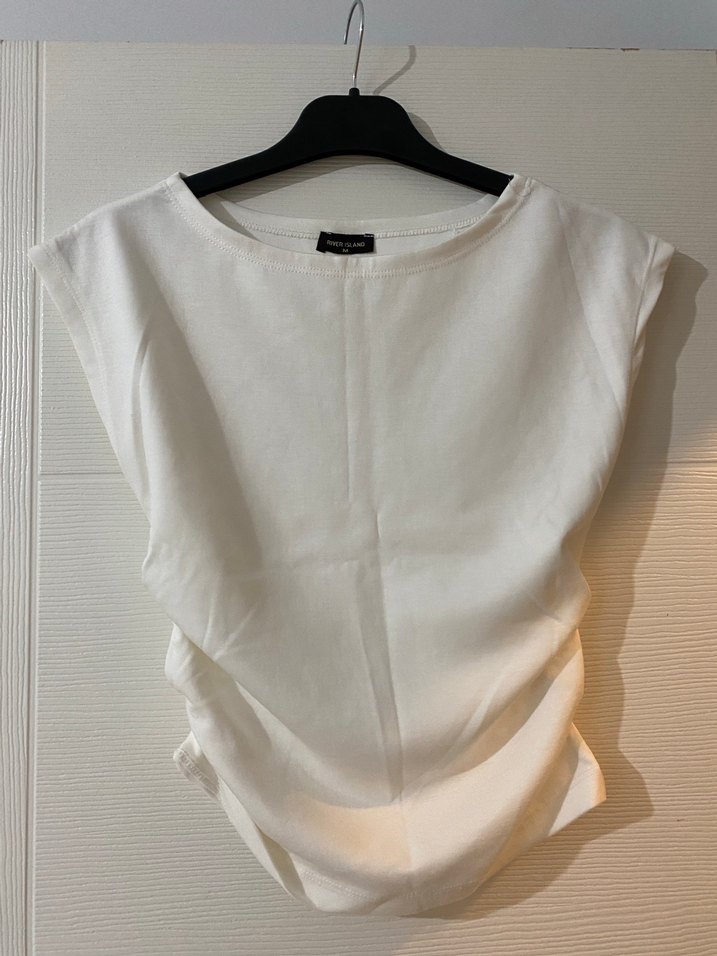 Pamuk kumaştan, yuvarlak yakalı ve kısa kollu, bol kesim kadın bluz. Drapeli tasarıma sahip, normal midi boyda, günlük kullanıma uygun.