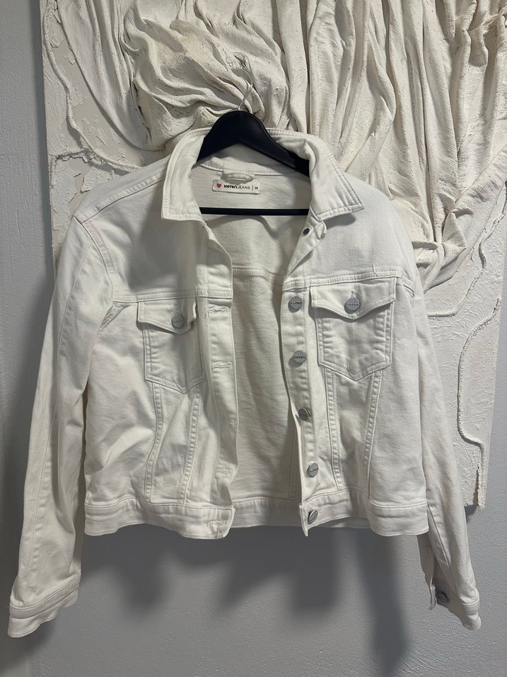 Düğmeli, kesimli beyaz denim ceket. Uzun kollu, keten kumaştan, günlük rahat sokak stili için uygun midi uzunlukta hiçbir deformesi yoktur alıcısna hayırlı olsun :)
