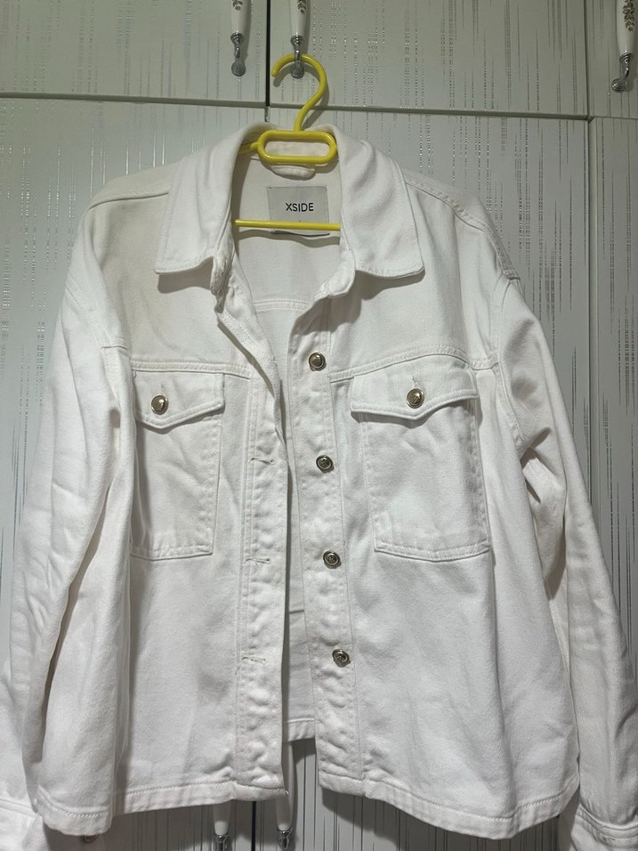 Beyaz pamuklu denim kumaştan, düğmeli, uzun kollu, notched lapel yakalı, bol kesim midi uzunlukta kadın ceket. Lcw markasına ait, günlük rahat stil için uygun. L beden Maxi 2 kere giyildi.
