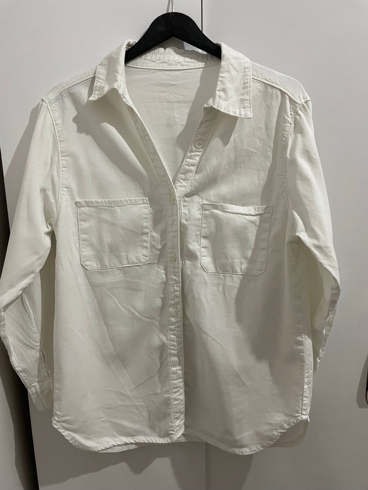 Düğmeli, yakalı ve uzun kollu beyaz gömlek. S ve bedene uygundur Defo yok Sadece bir kez kullanıldı