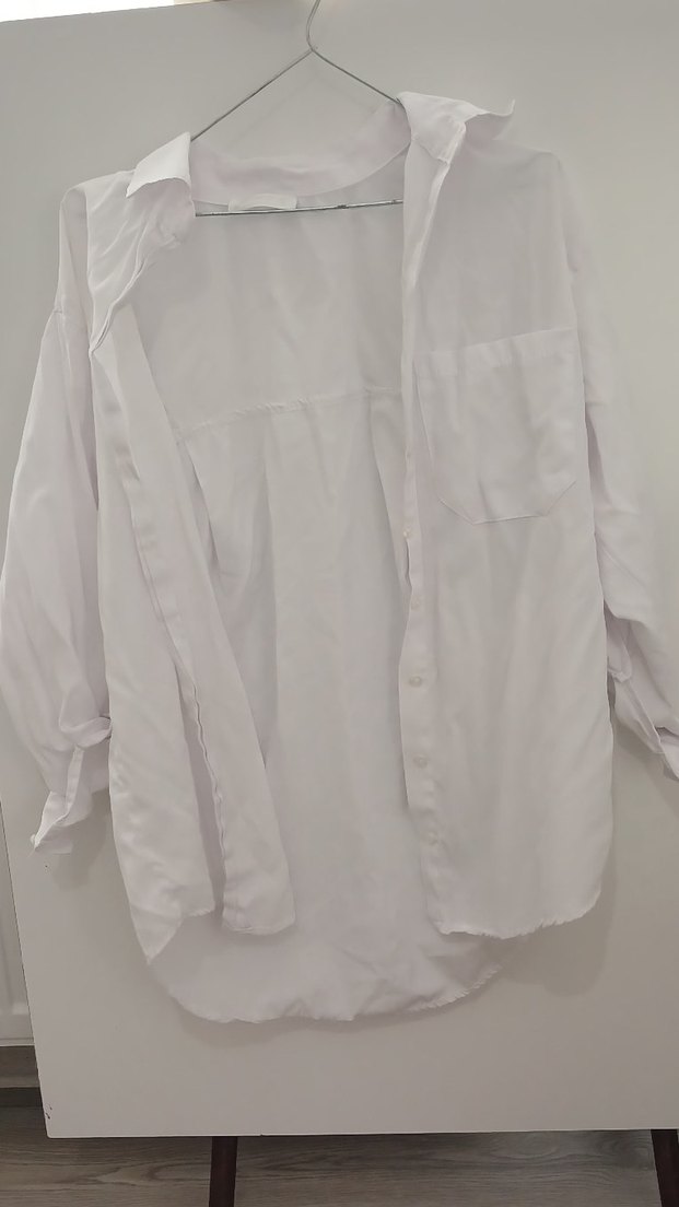 Uzun kollu, yakalı ve düğmeli beyaz keten gömlek, rahat kesimi ve cep detayıyla minimalist tarz sunar.