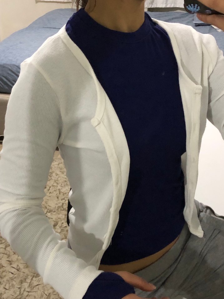 Pamuk kumaştan üretilmiş, yüksek yakalı ve uzun kollu, düğmeli, beyaz renkli kadın hırkası. İnce kesimi ve midi boyu günlük sokak stili için uygundur.