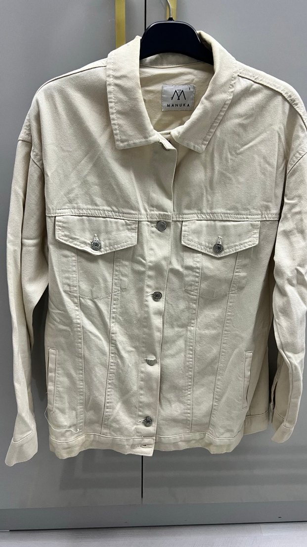 Kadın beyaz düğmeli keten denim ceket, notlu yaka ve uzun kolludur. Rahat kesimi ve desen içermeyen tasarımıyla günlük sokak stiline uygundur.