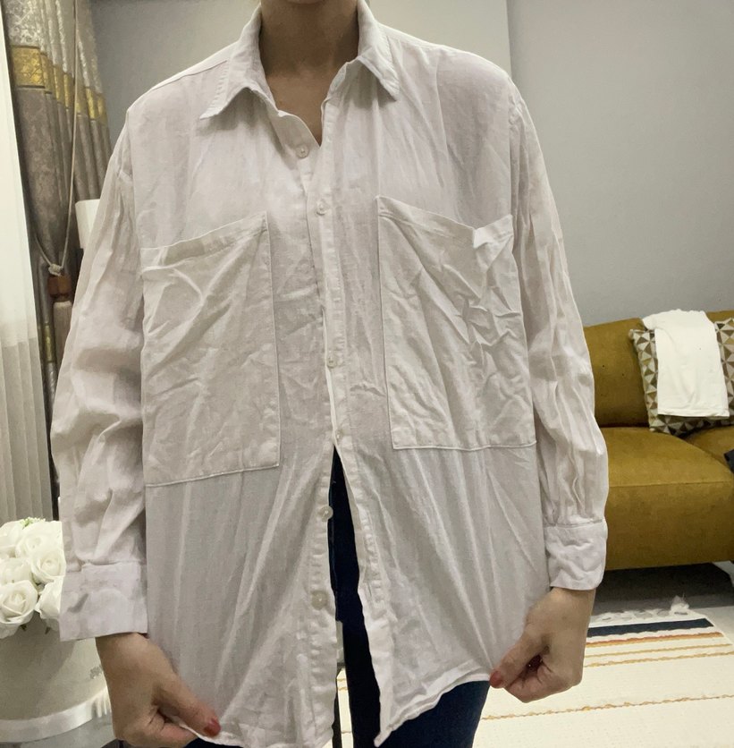 Uzun kollu, düğmeli, yakalı beyaz keten gömlek. Rahat kesimi ve iki ön cebiyle gündelik sokak stili için uygundur.
