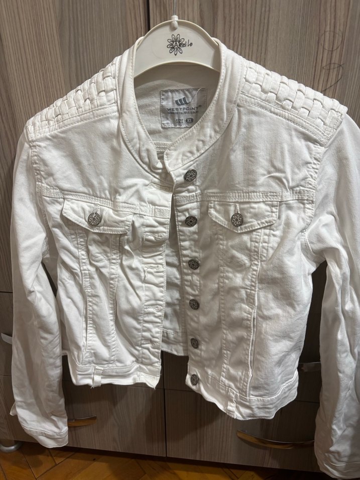Kadınlar için beyaz kot ceket, düğmeli, kısa ve fitted kesim. Notched lapel yakalı, uzun kollu, desen içermeyen günlük sokak stili için uygun.