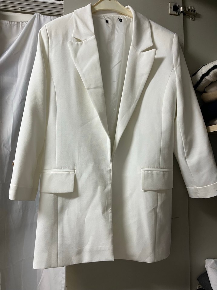 Düğmeli, normal uzunlukta beyaz midi blazer. Notlu yaka ve uzun kollu, sentetik kumaştan yapılmıştır. Ofis ve sokak stili için uygundur.