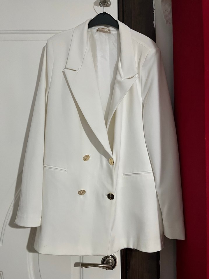 Kadın beyaz blazer, düğmeli ön, uzun kollu ve normal kesimdir. Satenimsi dokusu ile klasik ofis şıklığı sunar.