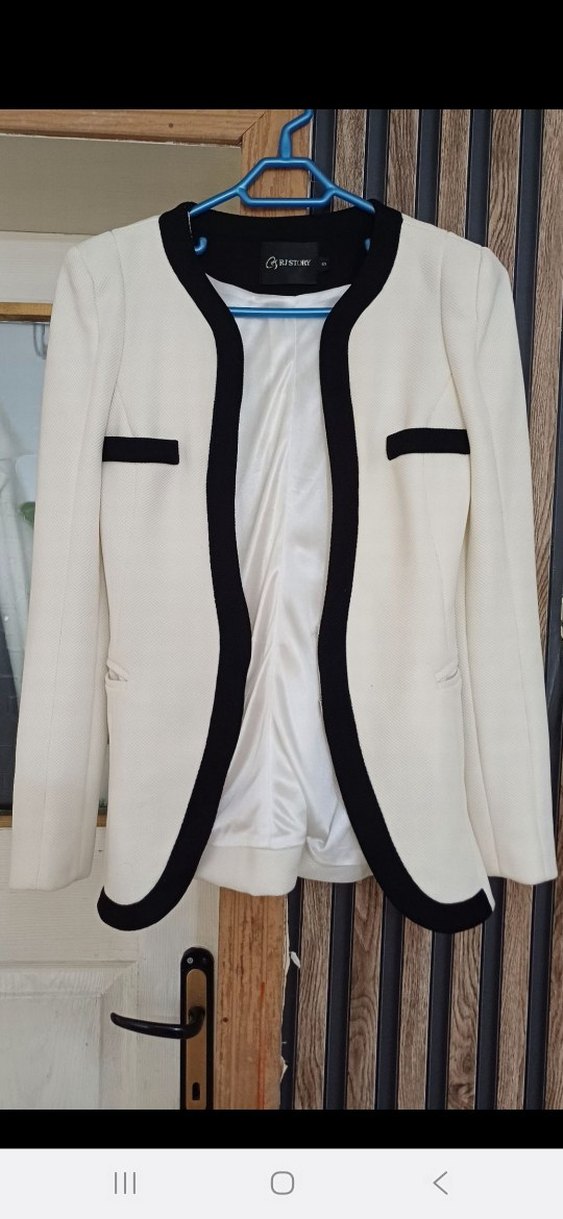 Kadınlar için tasarlanmış, düğmeli ve uzun kollu beyaz ofis blazeri. Siyah kontrast detaylı, normal kesim ve sentetik kumaştan üretilmiştir.