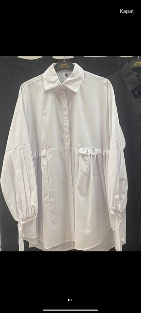 Kadınlar için beyaz keten gömlek, düğmeli, uzun kollu ve yakalıdır. Midi boyda, bol kesim ve bel kısmında hafif büzgü detayına sahiptir.