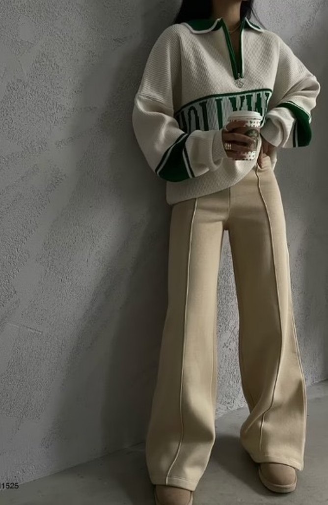 Örgü pamuklu kumaştan, baskı desenli , bol kesim beyaz düz paça midi pantolon, trend ve rahat stil için uygun. Sadece m beden mevcuttur