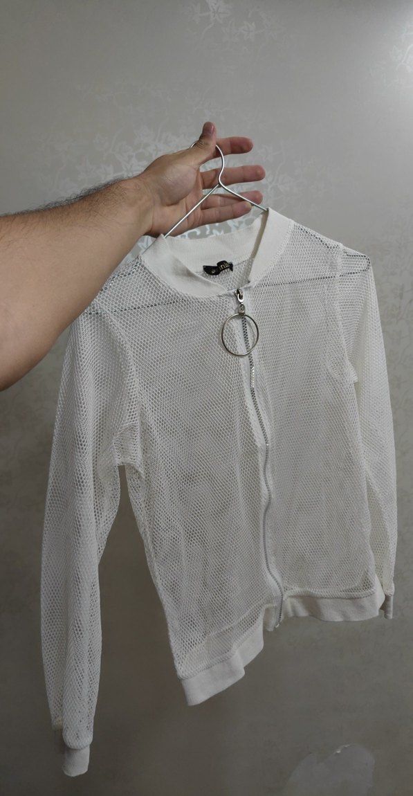 Bu beyaz, ince keten kumaştan yapılmış, fermuarlı, bisiklet yaka ve uzun kollu, vücuda oturan minimalist tasarımlı ceket günlük kullanım için uygundur.